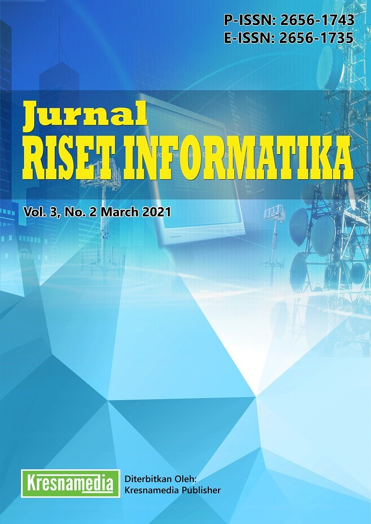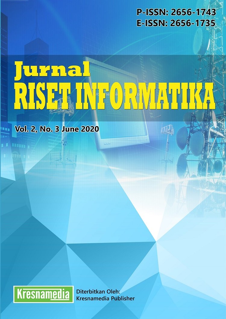 Jurnal Riset Informatika is a journal published by Kresnamedia Publisher. It has been accredited SINTA 3 (S3). Informatics Research Journal was originally intended to accommodate scientific papers from researchers and lecturers of Information Systems and Informatics Engineering study programs. Frequency of Publication: once every 3 months (4 times a year, namely March, June, September and December). ISSN (Printed): 2656-1743, & ISSN (Online): 2656-1735. Topics to be published by the Journal of Informatics Research (JRI) are related to the accumulation/accumulation of new knowledge, empirical observations or research results, and developing new ideas or proposals. Accepted manuscripts will be available online (free access).