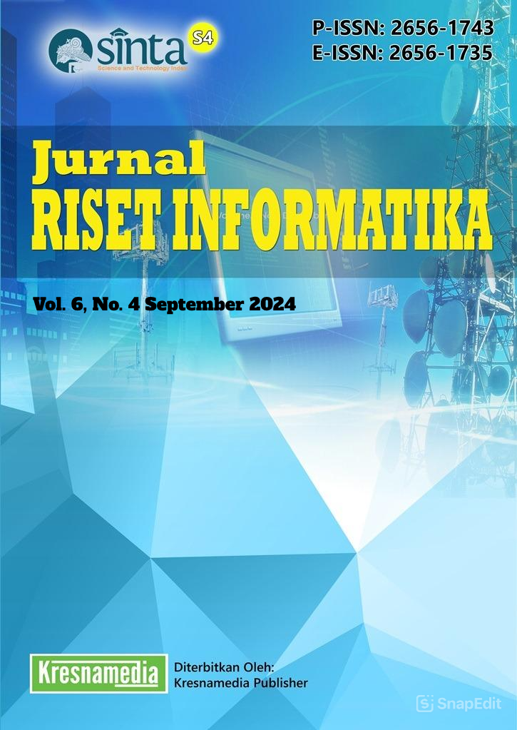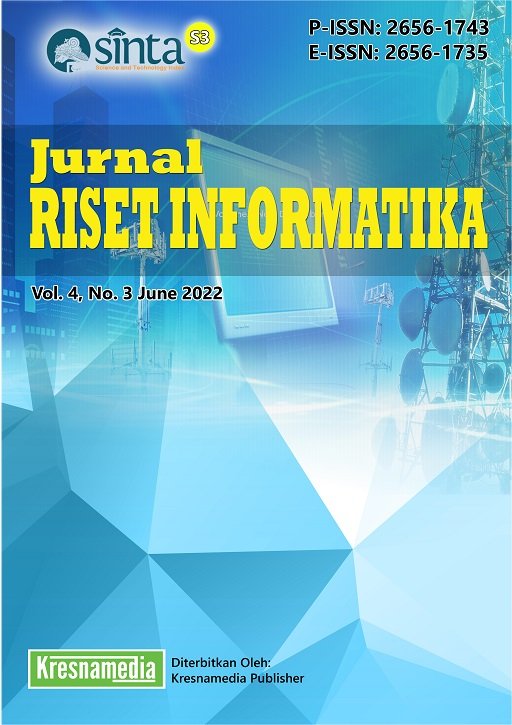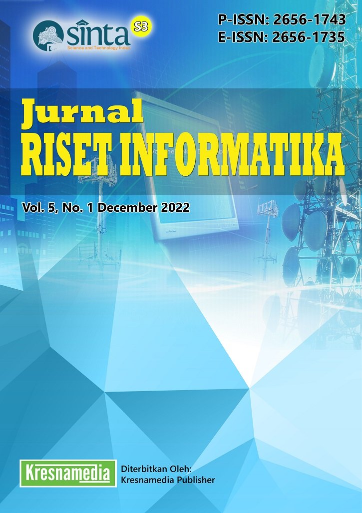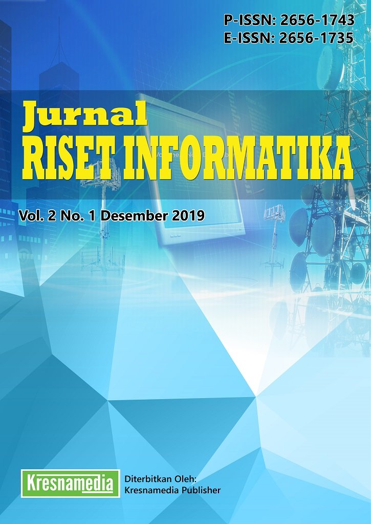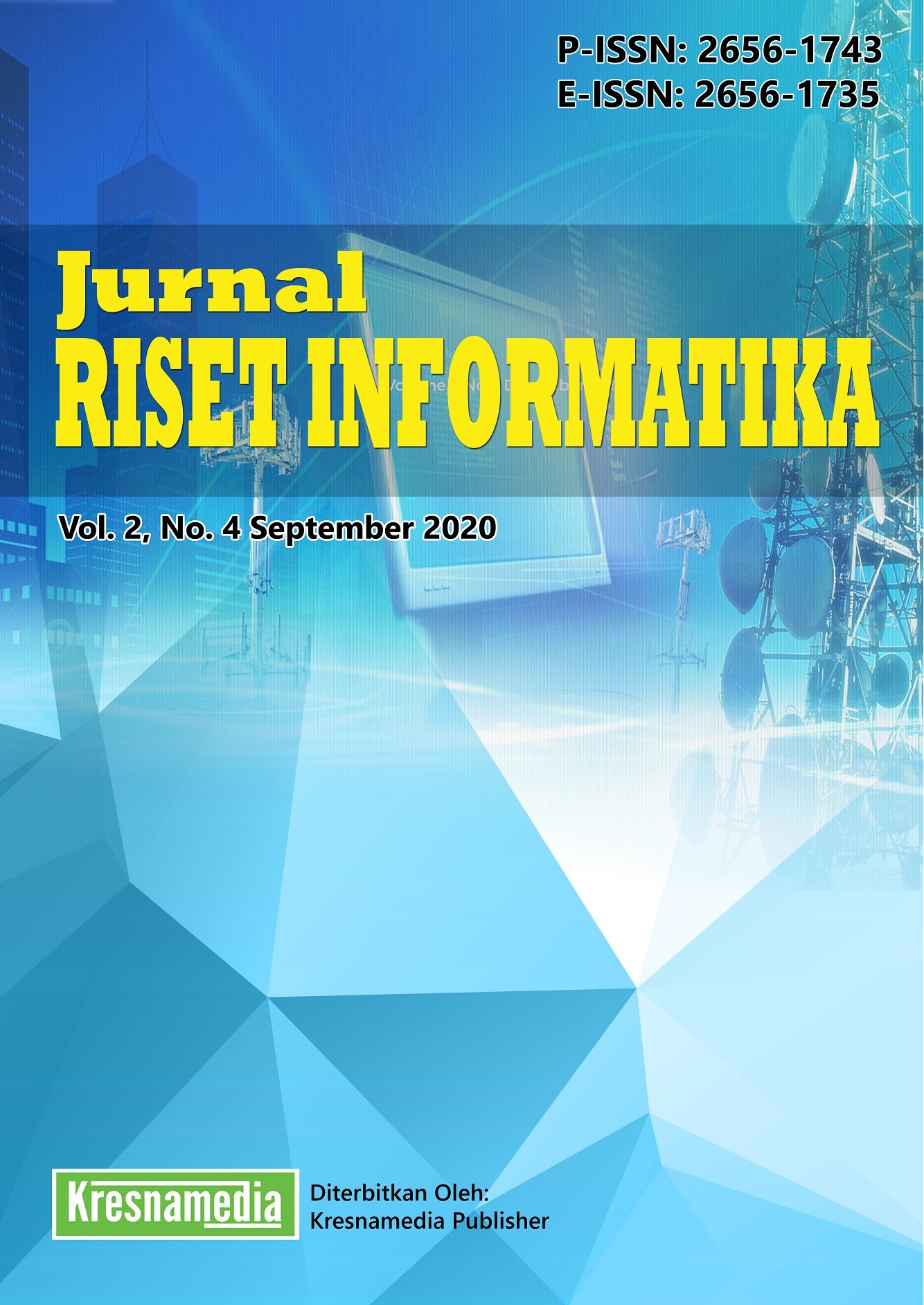 Jurnal Riset Informatika is a journal published by Kresnamedia Publisher. It has been accredited SINTA 4 (S4). Jurnal Riset Informatika was originally intended to accommodate scientific papers from researchers and lecturers of Information Systems and Informatics Engineering study programs. Frequency of Publication: once every three months (4 times a year, namely March, June, September, and December). ISSN (Printed): 2656-1743, & ISSN (Online): 2656-1735. Topics to be published by the Journal of Informatics Research (JRI) are related to the accumulation/accumulation of new knowledge, empirical observations or research results, and developing new ideas or proposals. Accepted manuscripts will be available online (free access).